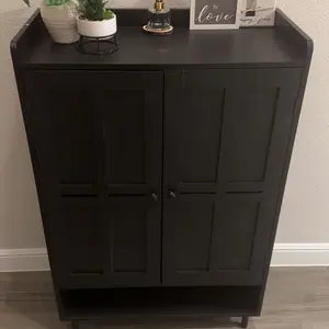 The cabinet fits 18–24 pairs, including boots, heels, sneakers, and flats, keeping your entryway neat and organized.